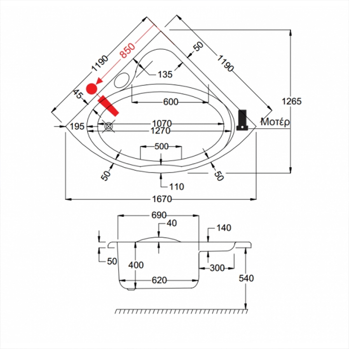 - Μπανιέρα με σύστημα υδρομασάζ , ηλεκτρονικό On /Off, 8 jet/1,75 hp, αισθητήρας στάθμης και πλαίσιο στήριξης.
