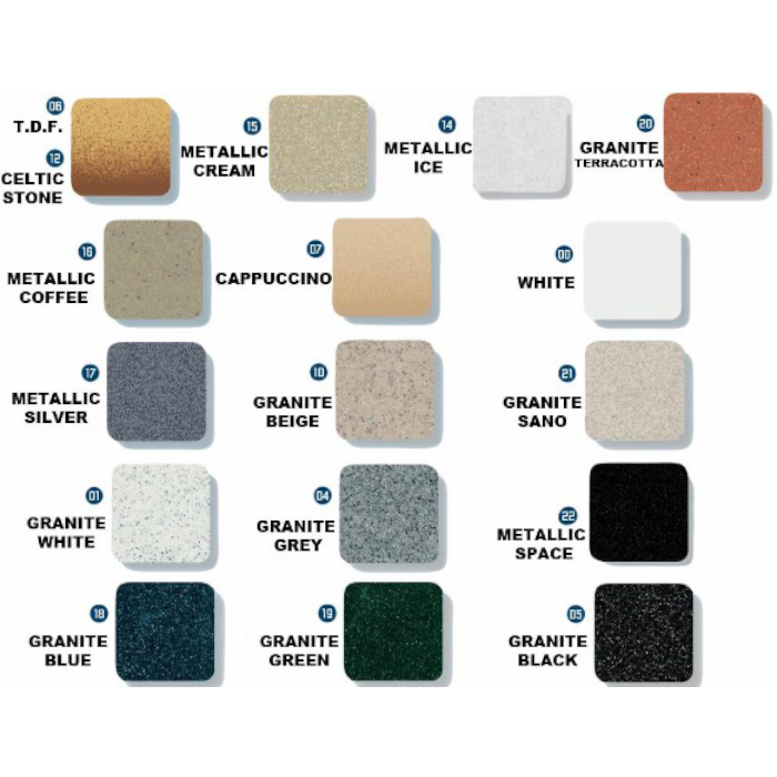 Διατίθεται σε όλες τις αποχρώσεις του χρωματολογίου: Metallic Space ή Metallic Coffee ή Metallic Crerm ή Metallic Ice ή Metallic Silver ή White ή Granite Beige ή Granite Sand ή Granite White ή Granite Grey ή Granite Black ή Granite Blue ή Granite Green ή Granite Terracotta ή Terre De France ή Cappuccino ή Celtic Stone
