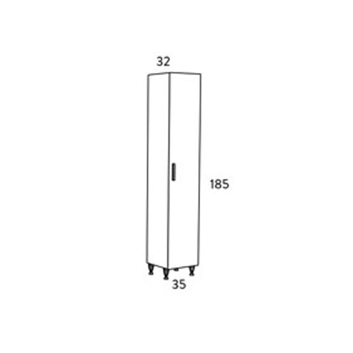 Μια μοντέρνα στήλη μπάνιου με μια πόρτα, μεταλλικό χερούλι, ποδαράκια στήριξης με ρεγουλατόρους, μηχανισμούς soft close και 3 εσωτερικά ράφια.