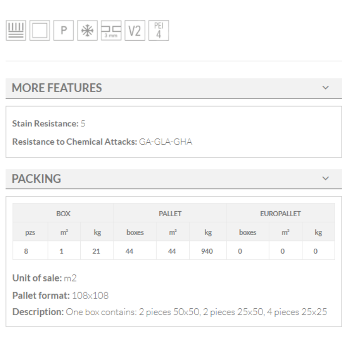 Κάθε κιβώτιο περιλαμβάνει 8 τεμάχια διαφορετικών διαστάσεων (50x50 cm, 2 τμχ / 25x25 cm, 2 τμχ / 25x50 cm, 2 τμχ), καλύπτοντας 1 m² ανά κιβώτιο. Η χρωματική απόκλιση V3 προσφέρει φυσική, ρεαλιστική εμφάνιση, ενώ η τοποθέτηση με συνιστώμενο αρμό 3 mm εξασφαλίζει άψογο αποτέλεσμα.