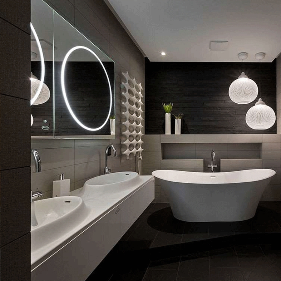 Ο φωτισμός είναι ένα πολύ σημαντικό στοιχείο. Τοποθετήστε δύο φωτιστικά δεξιά & αριστερά του καθρέπτη ή ένα από πάνω προκειμένου να μην δημιουργούνται σκιές. Είναι καλό να σκεφτείτε καλά τις θέσεις των φωτιστικών σας σημείων προκειμένου να περαστούν εξαρχής οι απαραίτητες γραμμές & να μην δημιουργηθούν μερεμέτια στην πορεία. Προμηθευτείτε φωτιστικά που ταιριάζουν στο στυλ & την αισθητική του μπάνιου. Μία καλή & σύγχρονη λύση για τη θέρμανση του μπάνιου σας είναι η τοποθέτηση θερμαινόμενης πετσετοκρεμάστρας αντί του συμβατικού σώματος καλοριφέρ. Πέρα από την θέρμανση του μπάνιου, παρέχει χώρο για να κρεμάτε ρούχα & πετσέτες.