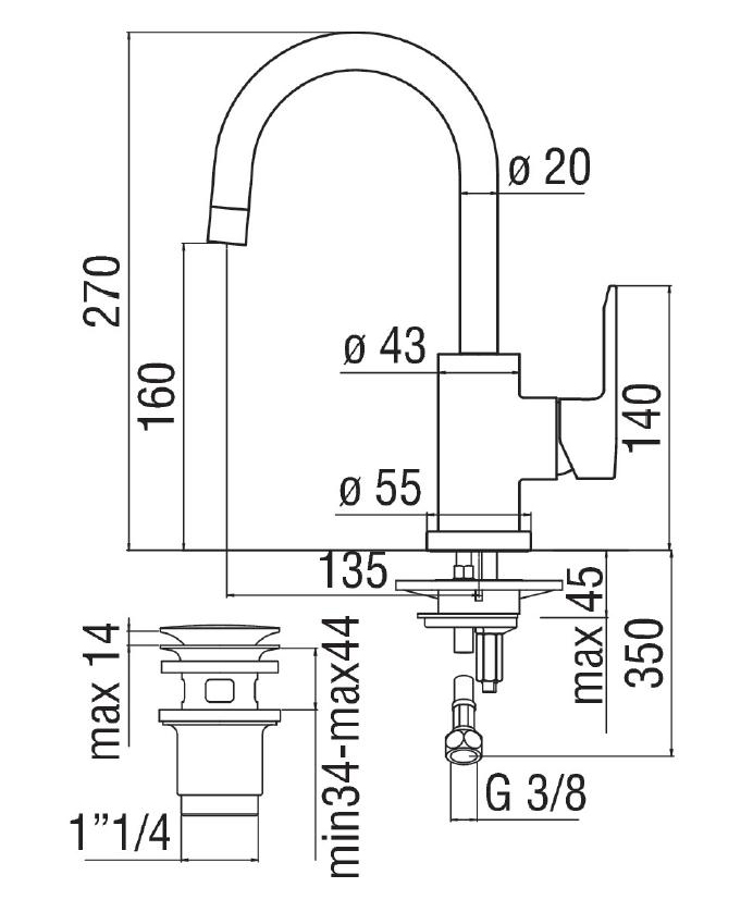 Μπαταρία νιπτήρος επιτραπέζια με Α/Β click-clack και ψηλό περιστρεφόμενο ρουξούνι