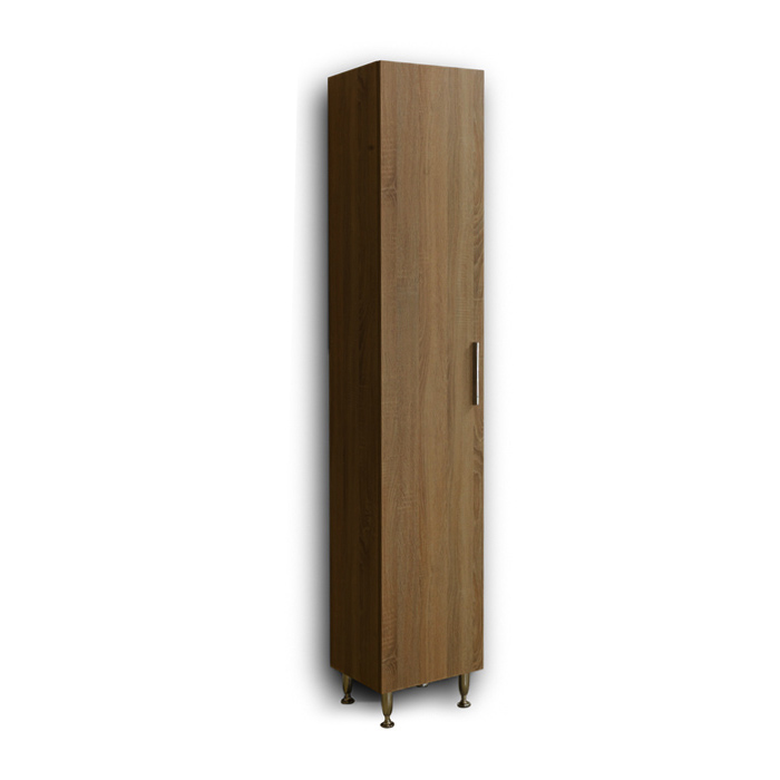 Μια μοντέρνα στήλη μπάνιου με μια πόρτα, μεταλλικό χερούλι, ποδαράκια στήριξης με ρεγουλατόρους, μηχανισμούς soft close και 3 εσωτερικά ράφια.